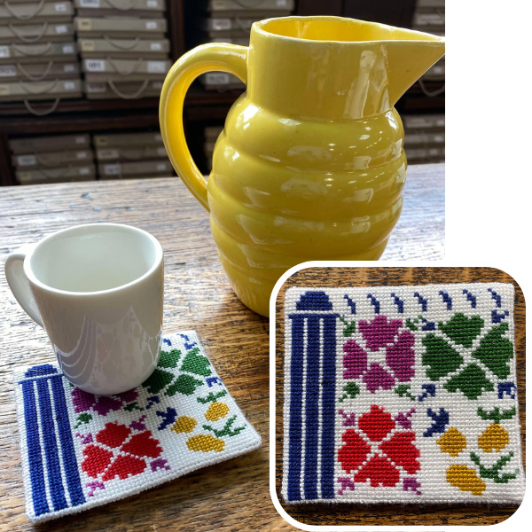 - le Kit en point de croix FLEURS ET FRUITS en soie d'alger sur aida coton...à transformer en sous-tasse !