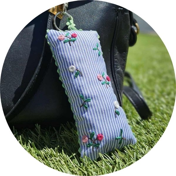 - Le coussinet reprenant une des premières robes brodées conçue par Poiret en ajoutant des rayures, motif adoré du créateur. Le kit inclus tout le matériel pour le transformer en bijou de sac !