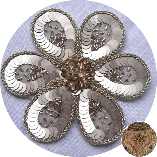 - La broche ROBE BYZANTINE avec de la soie et des métallisés AU VER A SOIE, des paillettes et de la cannetille
