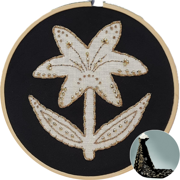 -Le FLEURS DE LYS avec son fond en velours, des métallisés AU VER A SOIE et des perles japonaises.